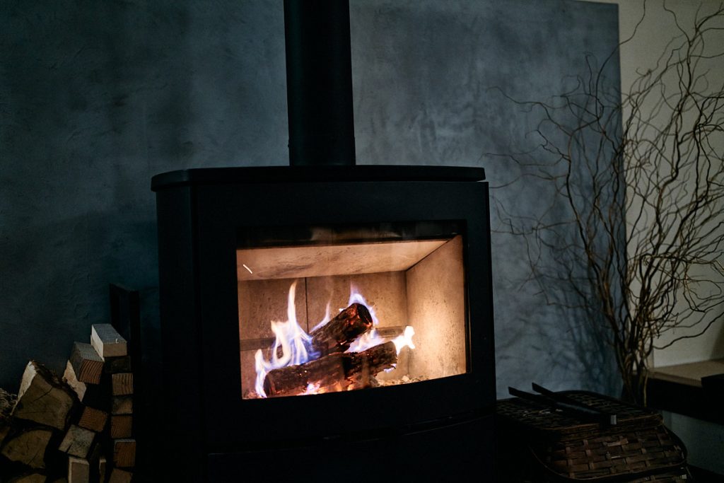 余裕のある駐車場に停めて、エントランスから、まずはチェックイン。暖炉用の薪がいっぱい
