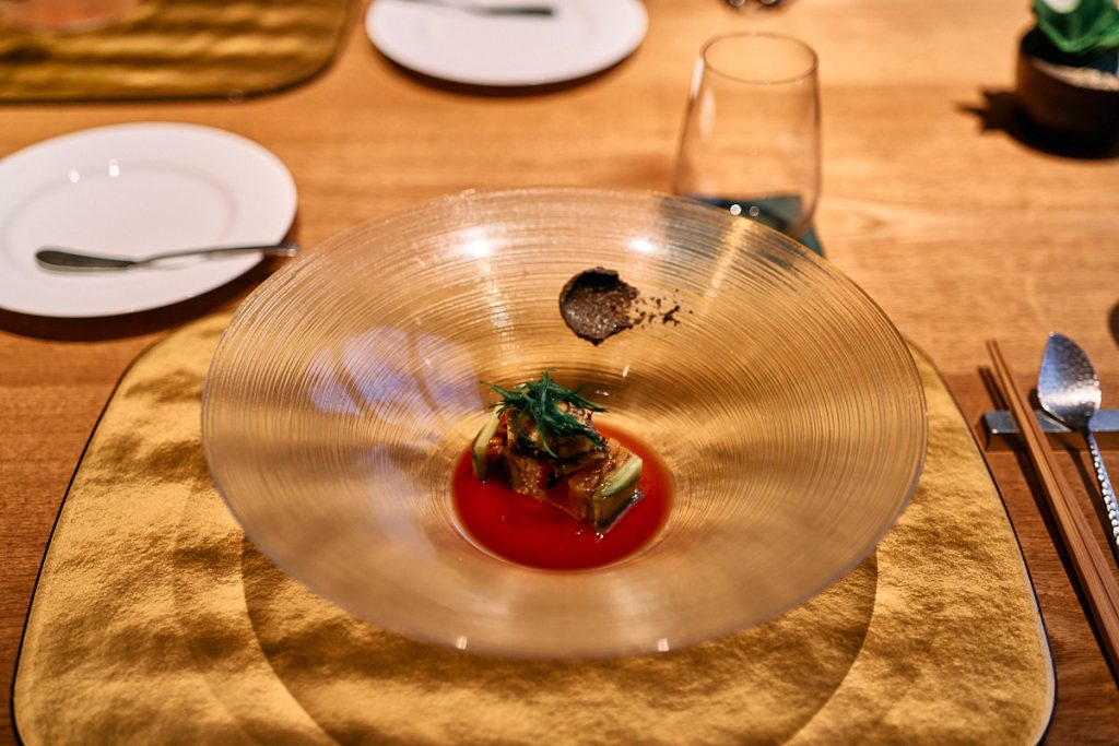 夏野菜のテリーヌと鮎のビスキュイ ガスパチョのソース