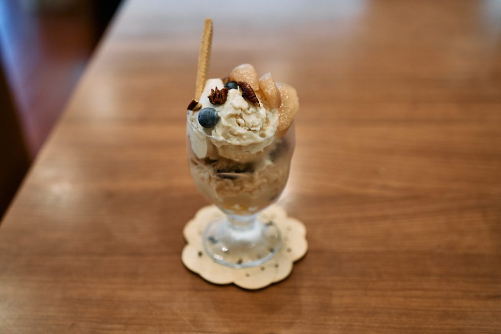 桃のコンポートとメープルクッキーの下に、甘麹アイス、パンケーキ、フレーク、プリン桃のゼリー等が層になっていて女子にはたまらない見た目